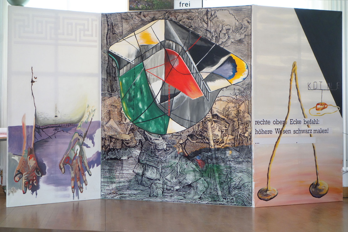 ... die Abbildung hier zeigt drei Leinwandbilder, die sich auf seine Arbeiten beziehen und Leporello-artig aufgestellt sind 130 / 170 / 130 x 210 cm … das linke hat auf der Rückseite ein Mäander mit Hakenkreuz aufgeklebt bekommen (ich kann beim besten Willen kein Hakenkreuz erkennen) das kann man beim Betrachten von vorne tatsächlich nur schwer identifizieren / ich habe es von hinten etwas beleuchtet, damit man es erkennen kann … das mittlere ist Kippenbergers Ertragsgebirge (auf den Kopf gestellt) und dazu Christophorus mit Kind … das rechte bezieht sich auf Sigmar Polke und seinen Satz, der hier verkehrt wurde …